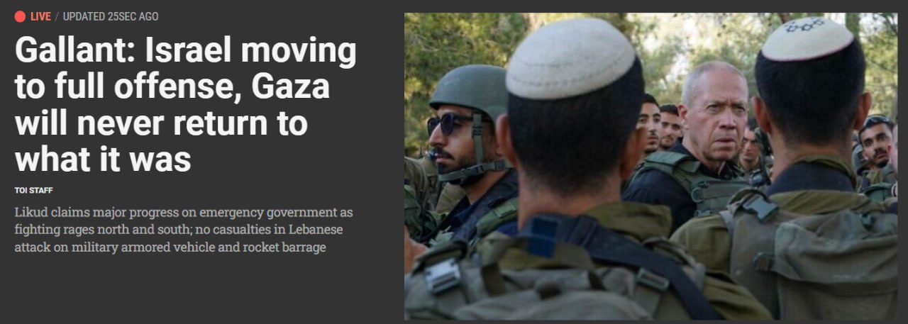 "Я снял все ограничения, мы возобновили контроль над территорией и переходим к полномасштабному наступлению. ХАМАС хотел перемен в секторе Газа, и он изменится на 180 градусов по сравнению с тем, что думали террористы. Они пожалеют об этом моменте. Газа никогда не вернется к тому, что было раньше. Это займет недели или месяцы. Кто бы ни пришел обезглавливать, убивать женщин, людей, переживших Холокост, мы уничтожим его всей нашей силой и без компромиссов", – сказал Галант.