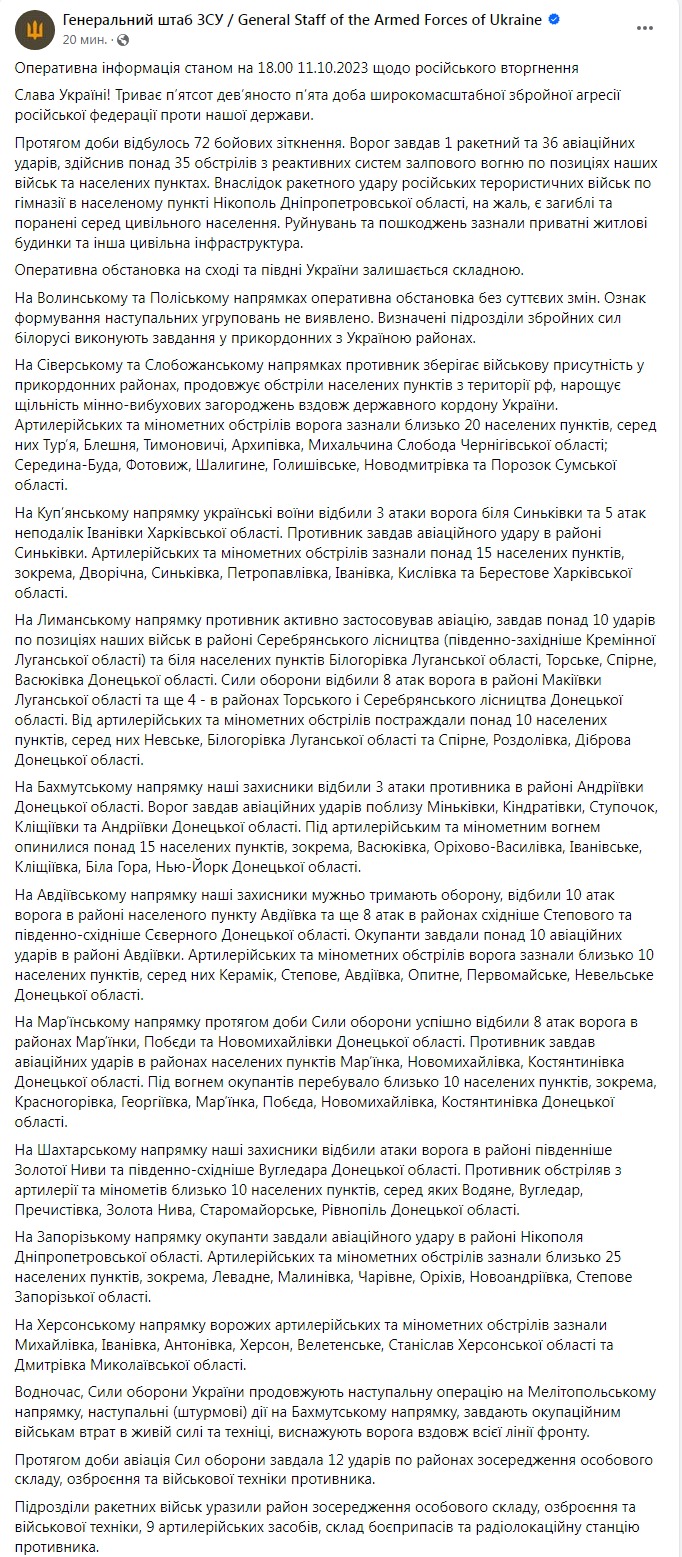 Генштаб ВСУ опубликовал оперативную информацию о положении на фронте по состоянию на 18:00 11 октября.
