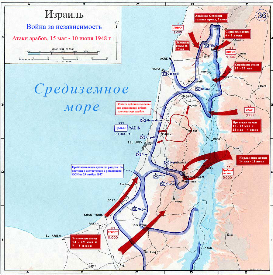 Тем не менее майское наступление арабской коалиции имело значительный успех на двух фронтах: на юге, где Египет выставил самый большой среди союзников контингент, а силы израильской армии оказались наименьшими, и на востоке, где действовал обученный британцами "Арабский легион". Первым удалось, наступая вдоль моря, приблизиться на расстояние 35 км к Тель-Авиву, вторым – взять под контроль почти всю территорию на Западном берегу Иордана, предназначенную для арабского государства, захватить старую часть Иерусалима и окружить новые районы города.