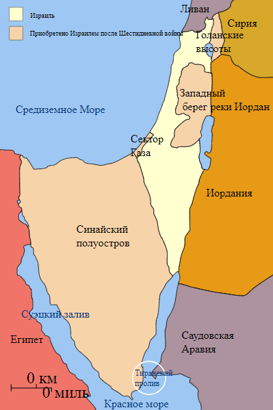 Правда, еврейское государство получало грузы – и прежде всего 95% необходимой нефти – не через Суэцкий канал, а через Тиранский пролив, ведущий из Красного моря в залив Акаба (это восточнее Синайского полуострова) мимо Шарм-аль-Шейха, но Насер закрыл для Израиля и его.