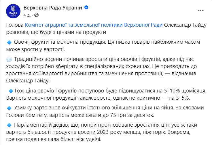 "Традиционно осенью начинает расти цена овощей и фруктов, ведь во время холодов их нужно хранить в специализированных хранилищах. Это приводит к росту себестоимости производства и уменьшению предложения, потому что хозяйства, не имеющие таких хранилищ, пытаются к началу холодов реализовать свою продукцию, а хозяйства, у которых есть склады, пытаются "растянуть" реализацию к началу лета, когда цена будет выше", - говорит Гайду.
