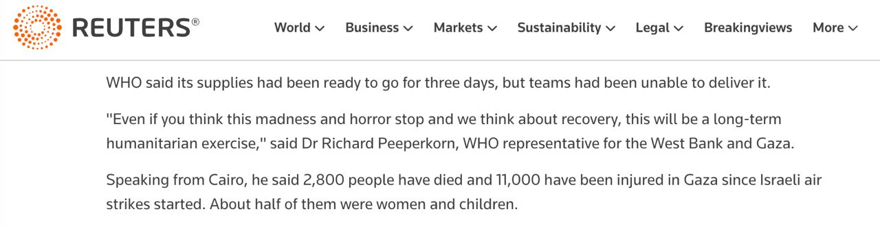Региональный представитель ВОЗ Ричард Пиперкорн заявил, что половина из 2800 погибших в секторе Газа от израильских авиаударов - это женщины и дети.