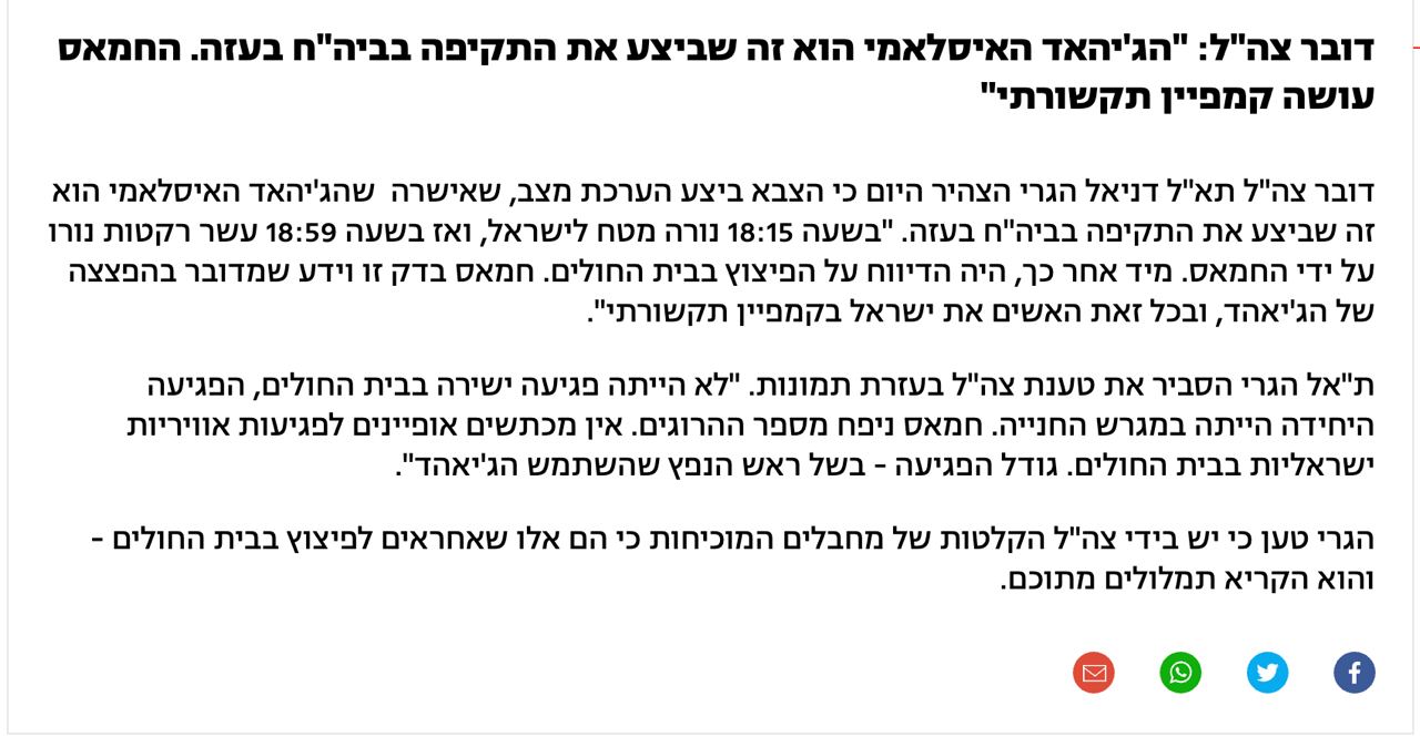 Об этом заявил представитель ЦАХАЛ бригадный генерал Даниэль Хагари, передает местный канал 13tv.