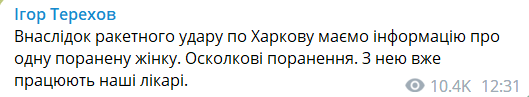 "В результате ракетного удара по Харькову имеем информацию об одной раненой женщине. Осколочные ранения. С ней уже работают врачи", - добавил Терехов.