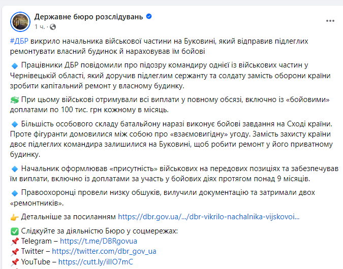 Большая часть личного состава батальона, приписанного к части, воюет на Донбассе. А сержант и солдат договорились с командиром, что останутся на Буковине и будут ремонтировать ему дом, получая все выплаты в полном объеме, включая боевые доплаты по 100 тысяч гривен каждому в месяц. Выплаты начислялись в течение девяти месяцев.