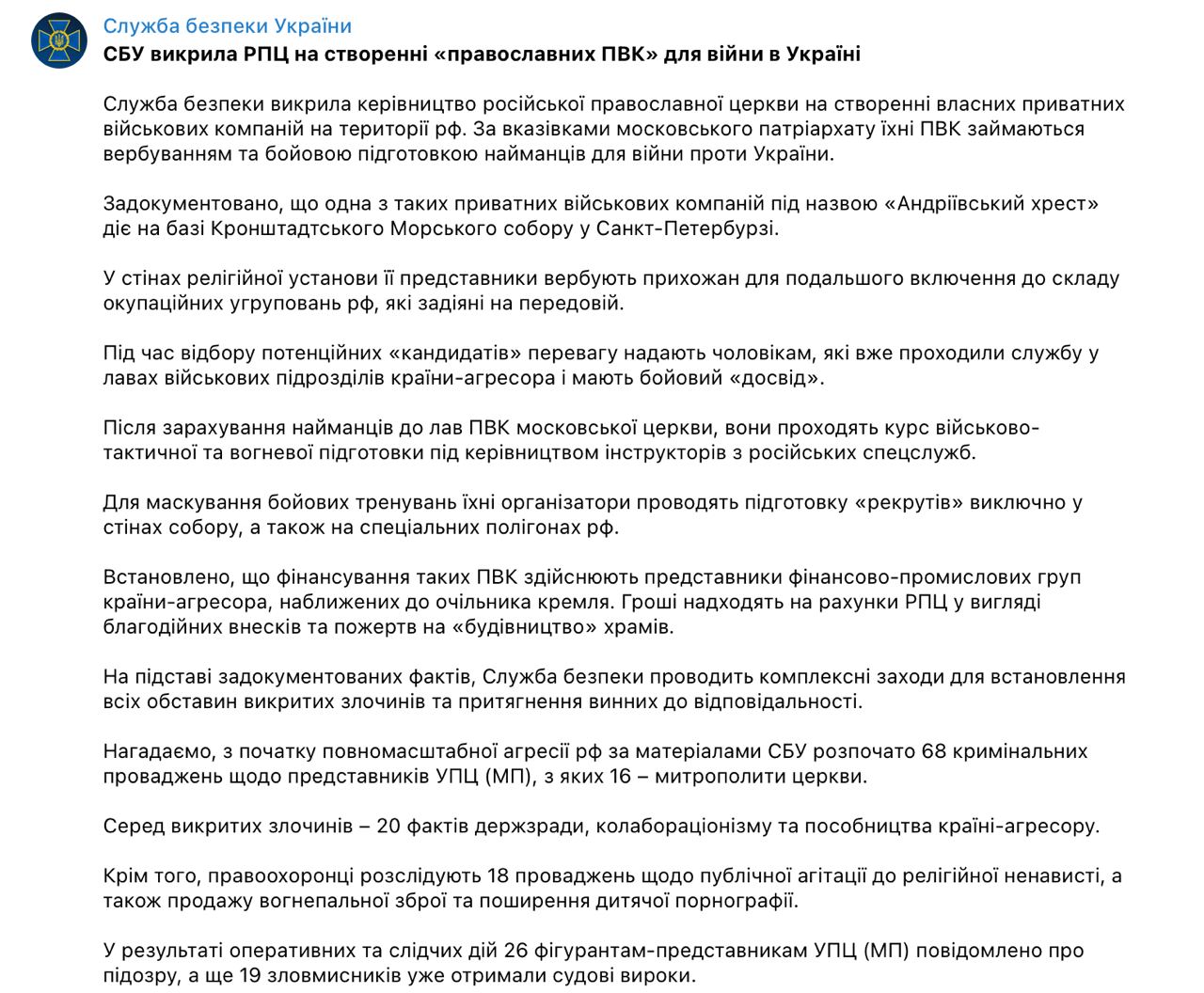 СБУ сообщает, что РПЦ создает "православные ЧВК" для войны в Украине.