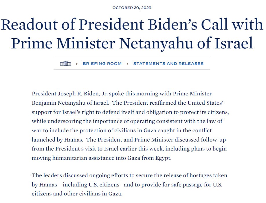 Президент США Джо Байден в разговоре с премьер-министром Биньямином Нетаньяху подтвердил право Израиля на оборону, но заявил, что важно соблюдать "законы войны", включая защиту мирных жителей Газы.