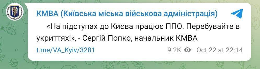 22:40 О работе ПВО под Киевом сообщает глава Киевской городской военной администрации.