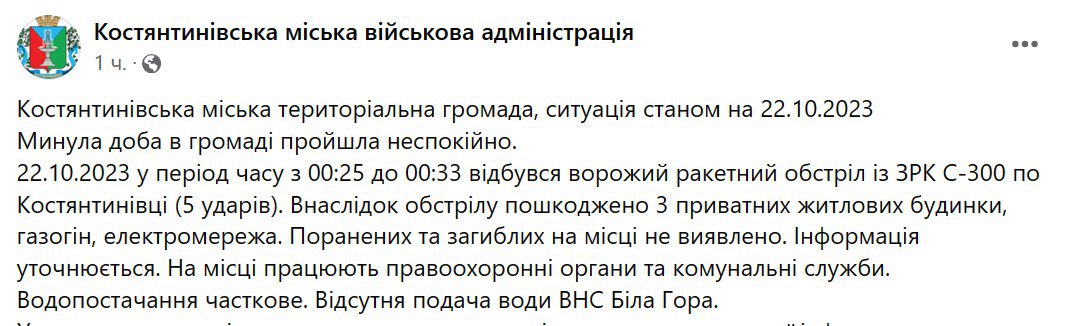 11:35 Ночью было пять ударов по Константиновке Донецкой области. Стреляли из комплекса С-300.