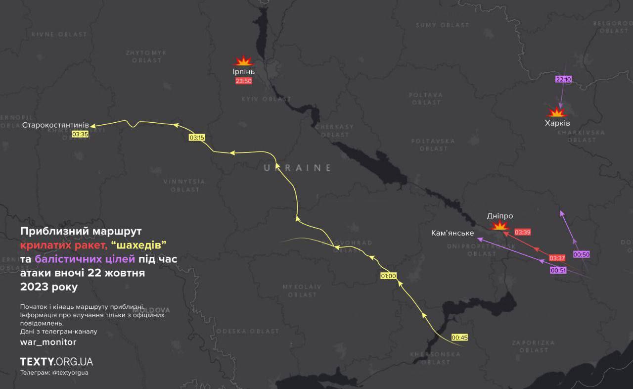 14:06 Приблизительный маршрут ракет и "Шахедов" во время ночной атаки по Украине.