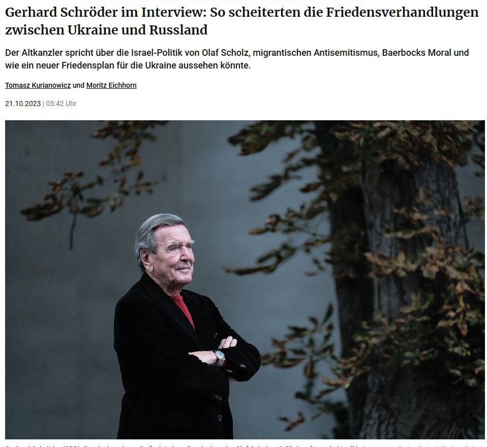 Шредер говорит, что в 2022 году получил запрос из Украины с предложением выступить посредником между Россией и Украиной, передав послание Путину. По словам экс-канцлера, в этом процессе участвовал нынешний министр обороны Рустем Умеров.