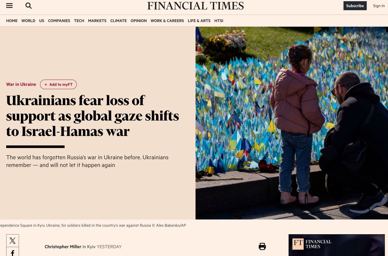 Financial Times пишет, что Украина опасается потери поддержки и переключения внимания мира на Израиль