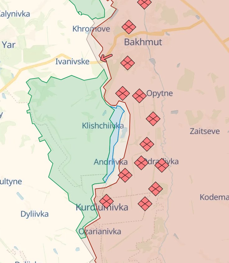 Также есть динамика под Бахмутом. Deep State пишет, что россияне провели атаку в сторону Ивановского и получили "частичный успех" у трассы, которая связывает Бахмут с Часов Яром.