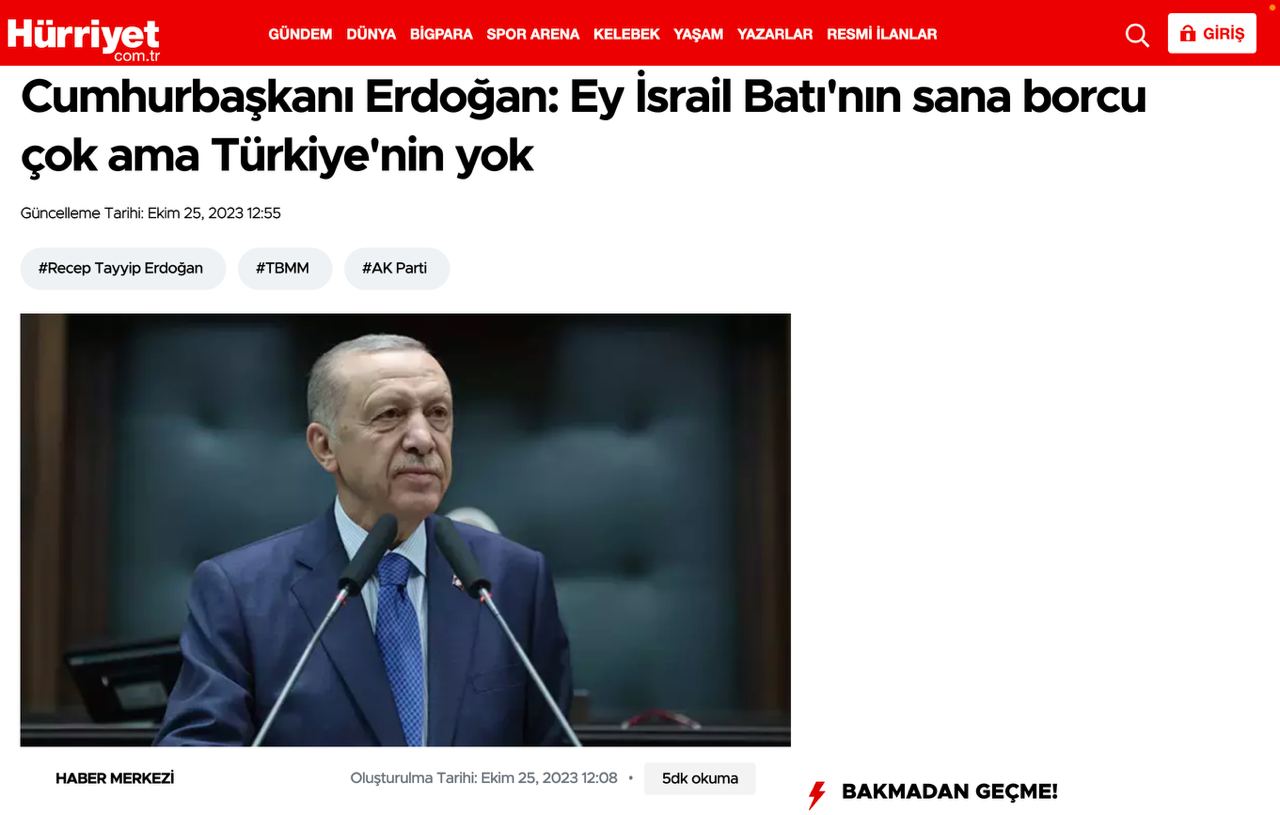"ХАМАС – это не террористическая организация, а освободительная организация, борющаяся за защиту своей земли. Израиль, Запад вам очень многое должен, Турция вам ничего не должна", - заявил президент Турции.