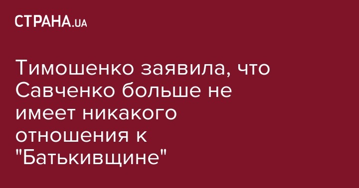 Лидер партии "Батькивщина" Юлия Тимошенко заявила, что член ее фракции и первый номер в списке на парламентских выборах Надежда Савченко больше не имеет никакого отношения к "Батькивщине". Такое заявление Тимошенко сделала во время брифинга, который транслировал телеканал NewsOne.