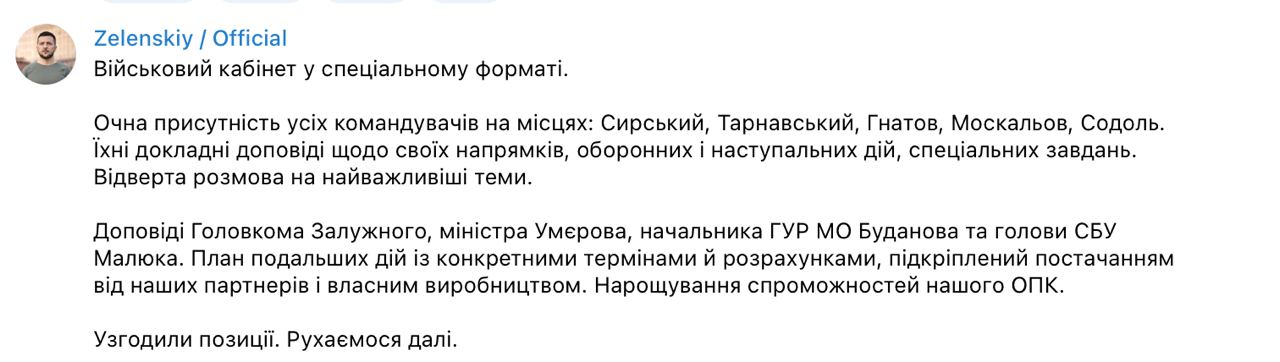 Докладывали главком Валерий Залужный, министр обороны Рустем Умеров, начальник ГУР Кирилл Буданов, глава СБУ Василий Малюк.