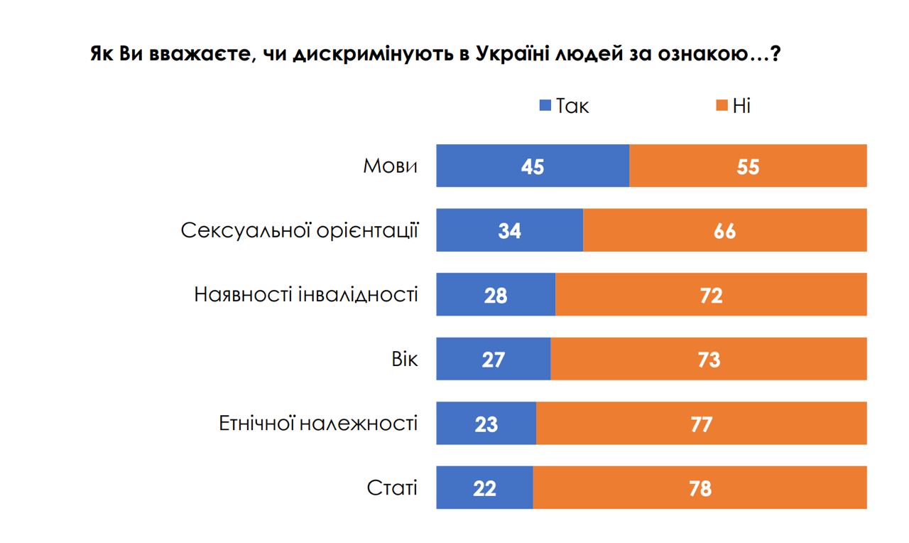 Многие считают, что в Украине дискриминируются люди по определенному признаку. Больше всего респондентов (45%) заявили о дискриминации по признаку языка. На условно втором месте (34%) – по сексуальному признаку. Около четверти респондентов говорят о дискриминации по признаку инвалидности (28%), возрасту (27%), этнической принадлежности (23%) и полу (22%).