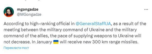 "По результатам встречи военного командования Украины с военным командованием союзников темпы поставки оружия в Украину не снизятся", - написала она.