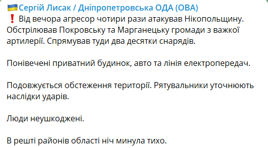 "С вечера агрессор четырежды атаковал Никопольщину. Обстреливал Покровскую и Марганецкую громады из тяжелой артиллерии. Направил туда два десятка снарядов", - написал Лысак.
