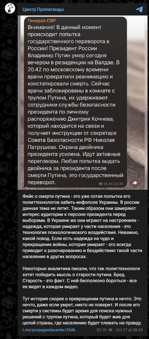 Директор Украинского института будущего Вадим Денисенко полагает, что при помощи столь абсурдных фейков российские власти пытаются высмеять тему "двойников Путина", которую муссируют, в том числе в Украине.