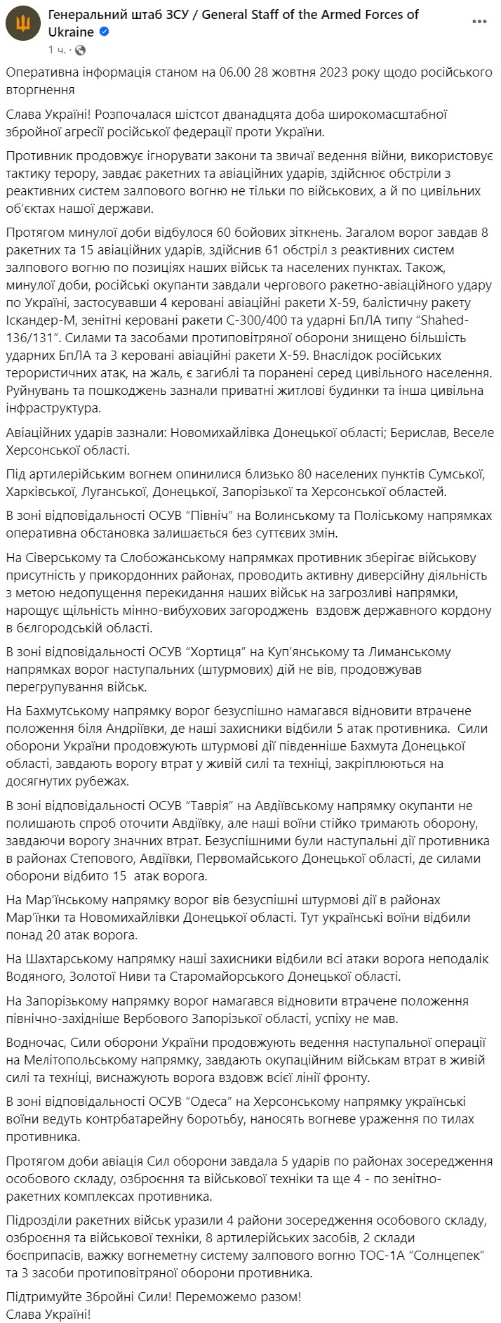 За прошедшие сутки произошло 60 боевых столкновений. Всего РФ нанесла 8 ракетных и 15 авиационных ударов, совершила 61 обстрел из реактивных систем залпового огня по позициям наших войск и населенным пунктам.