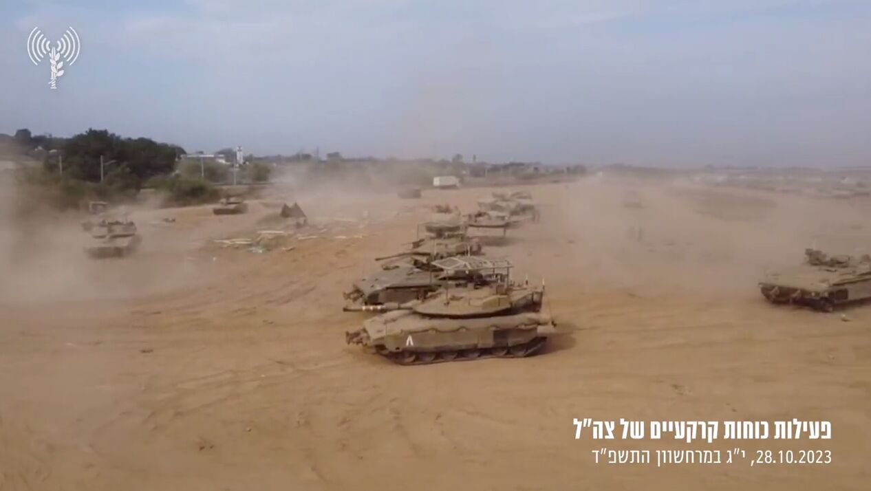 Армия Израиля публикует кадры действий своих сухопутных войск в секторе Газа. На них видны подразделения пехоты, инженерных войск и танков. Утверждается, что они находятся в секторе Газа с ночи.