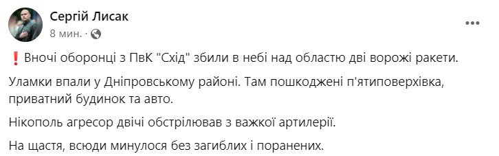 "Ночью защитники из ПВК "Восход" сбили в небе над областью две вражеские ракеты", - написал он.
