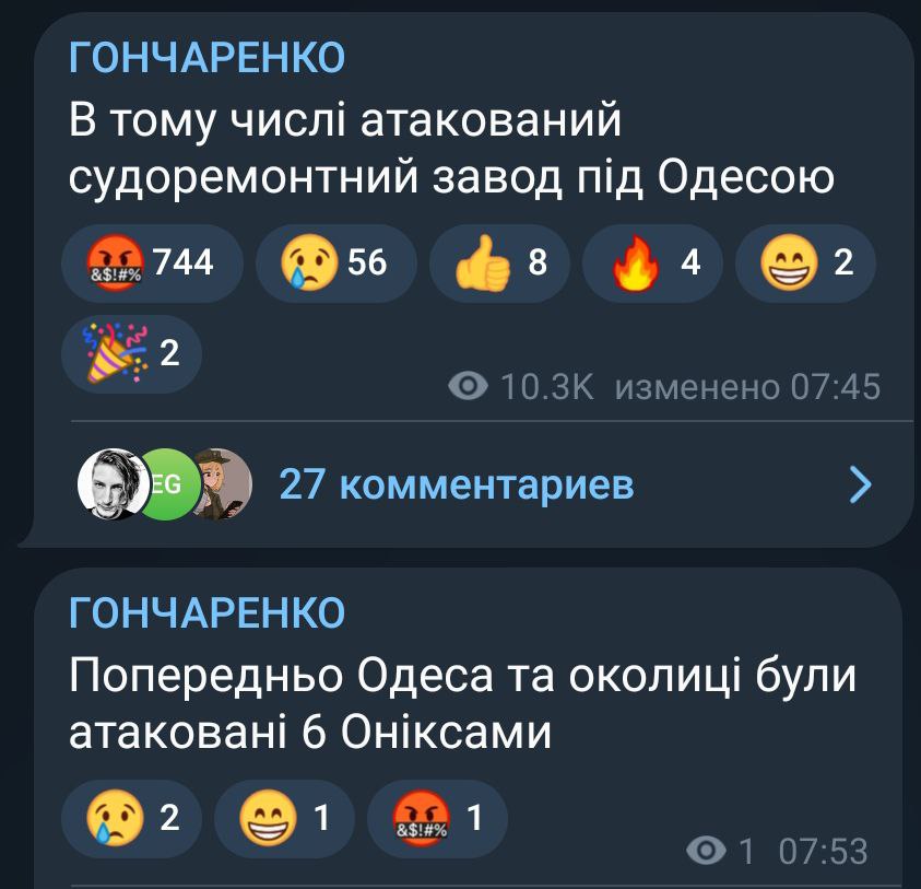 08:54 Нардеп Гончаренко заявил, что под Одесской атакован судоремонтный завод.
