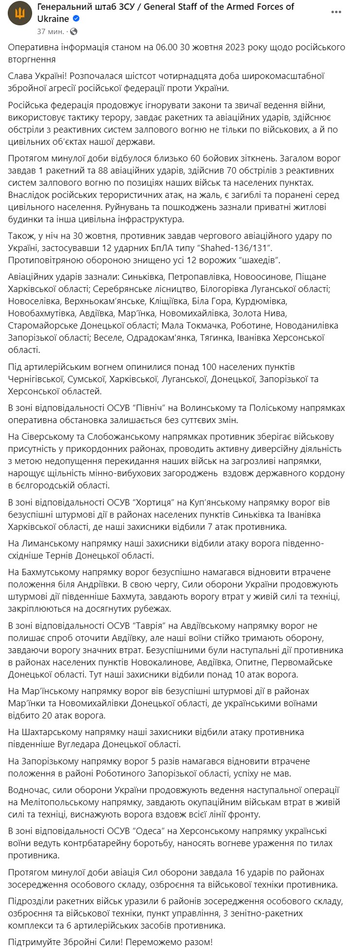 За прошедшие сутки произошло около 60 боевых столкновений. Всего россияне нанесли один ракетный и 88 авиационных ударов, совершили 70 обстрелов из реактивных систем залпового огня по позициям наших войск и населенным пунктам.