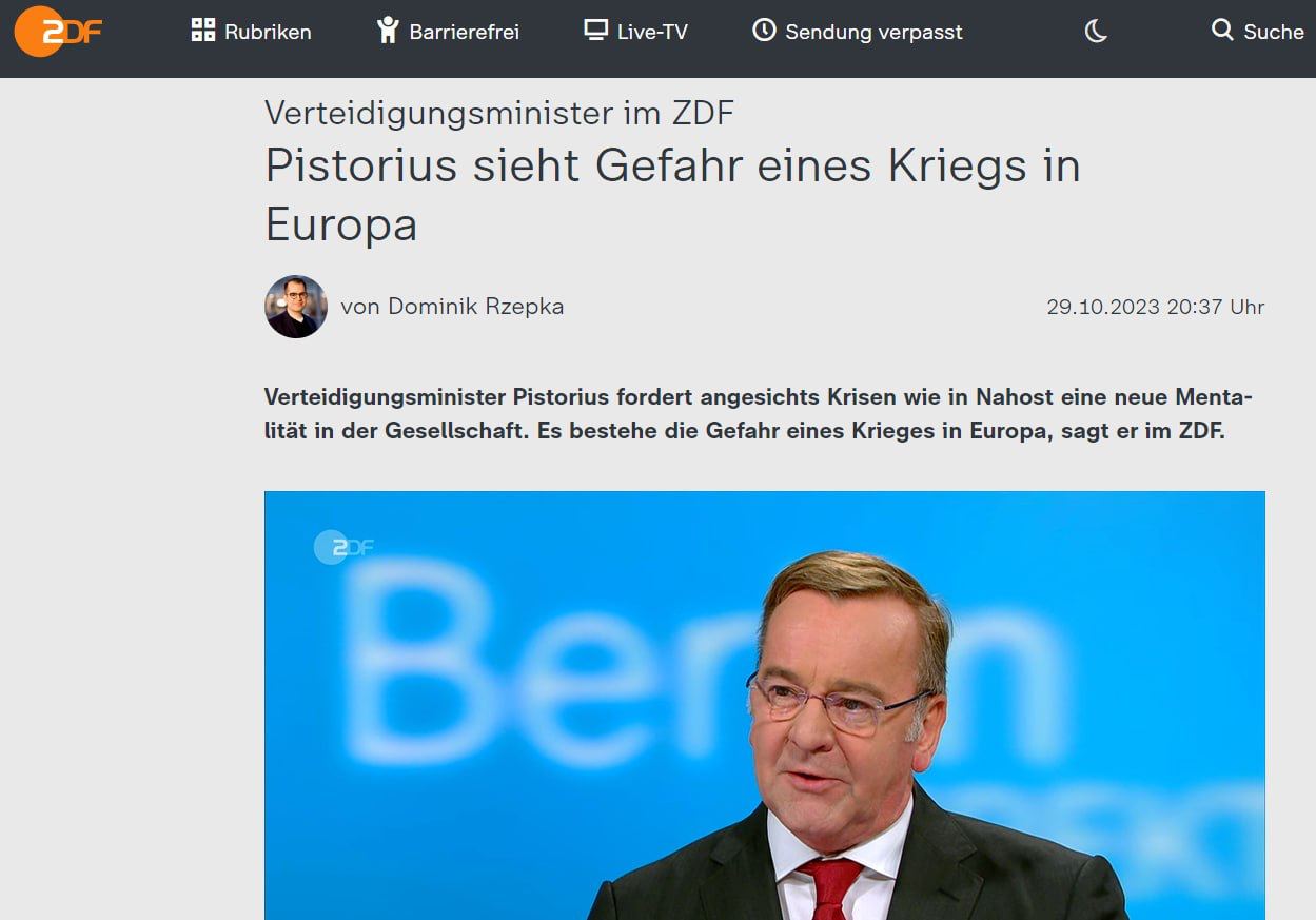 Министр обороны Германии Борис Писториус заявил о риске войны в Европе. Об этом он сказал в эфире телеканала ZDF.