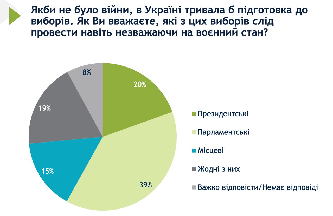 Из тех, кто высказался за проведение выборов во время боевых действий, 39% считают, что нужно провести президентские выборы, 20% - парламентские, 15% - местные.