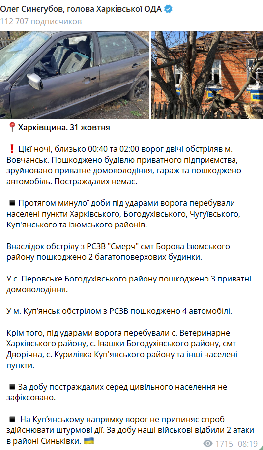 Об этом сообщает глава Харьковской ОВА Олег Синегубов.