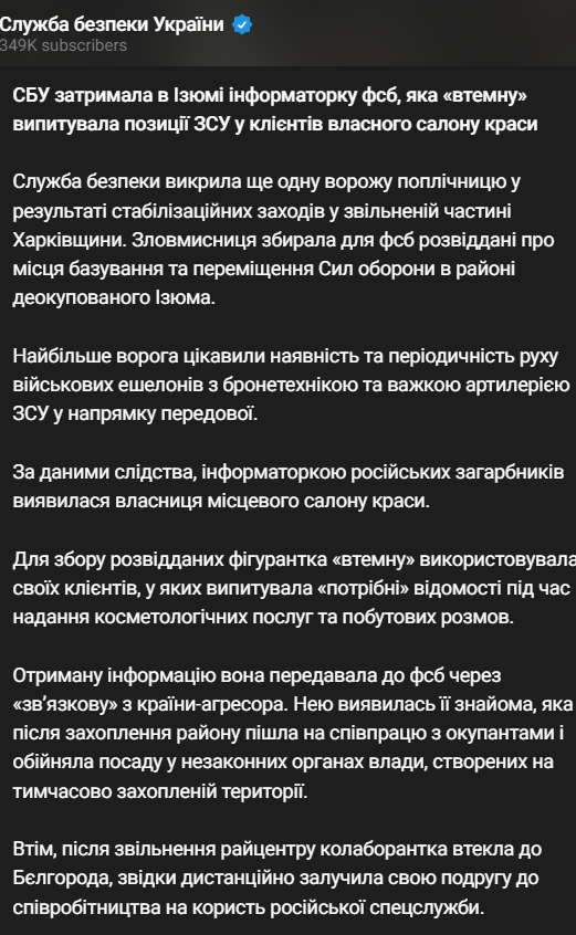 По данным следствия, во время предоставления косметологических услуг и бытовых разговоров с клиентами она незаметно расспрашивала их о позициях ВСУ и движении военной техники.