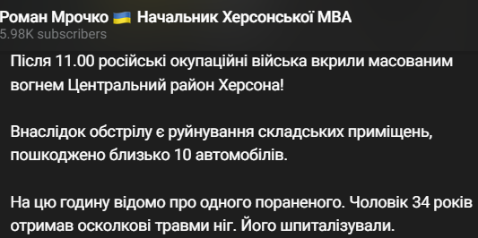 Центр Херсона сегодня днем подвергся очередному обстрелу. Разрушены складские помещения, повреждено около 10 автомобилей. Один мужчина ранен.