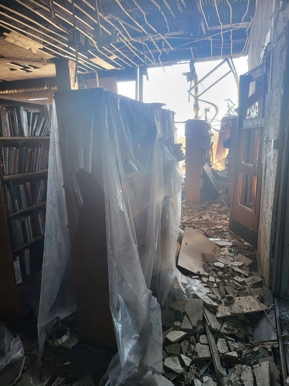Также сообщается, что пострадала библиотека. В ней начался пожар, здание существенно повреждено.