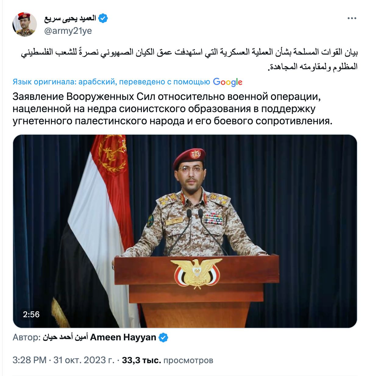 Об этом сказал в видеообращении, опубликованном в соцсети Х, йеменский бригадный генерал Яхья Сари.