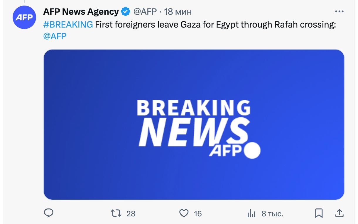 Египет открыл КПП "Рафах" для эвакуации иностранцев из сектора Газа. Первые иностранцы уже начали проходить через него.