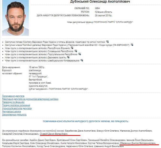 Кроме того, среди помощников Дубинского ранее был указан Сичевой Денис Валентинович, который также как и Оберемчук фигурирует как один из основателей общественных организаций "Слуга Народа: Херсонщина" и "Слуга Народа: Киевщина". Также в 2020 году Сичевой был избран депутатом Киевского областного совета от партии "Слуга Народа".
