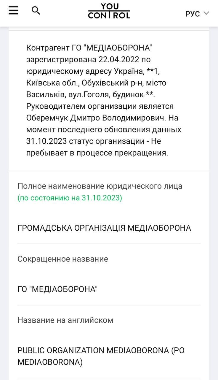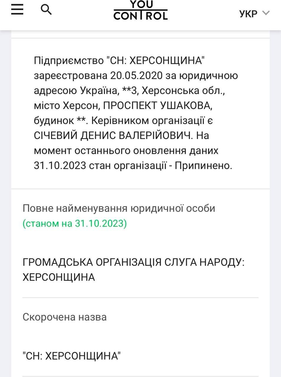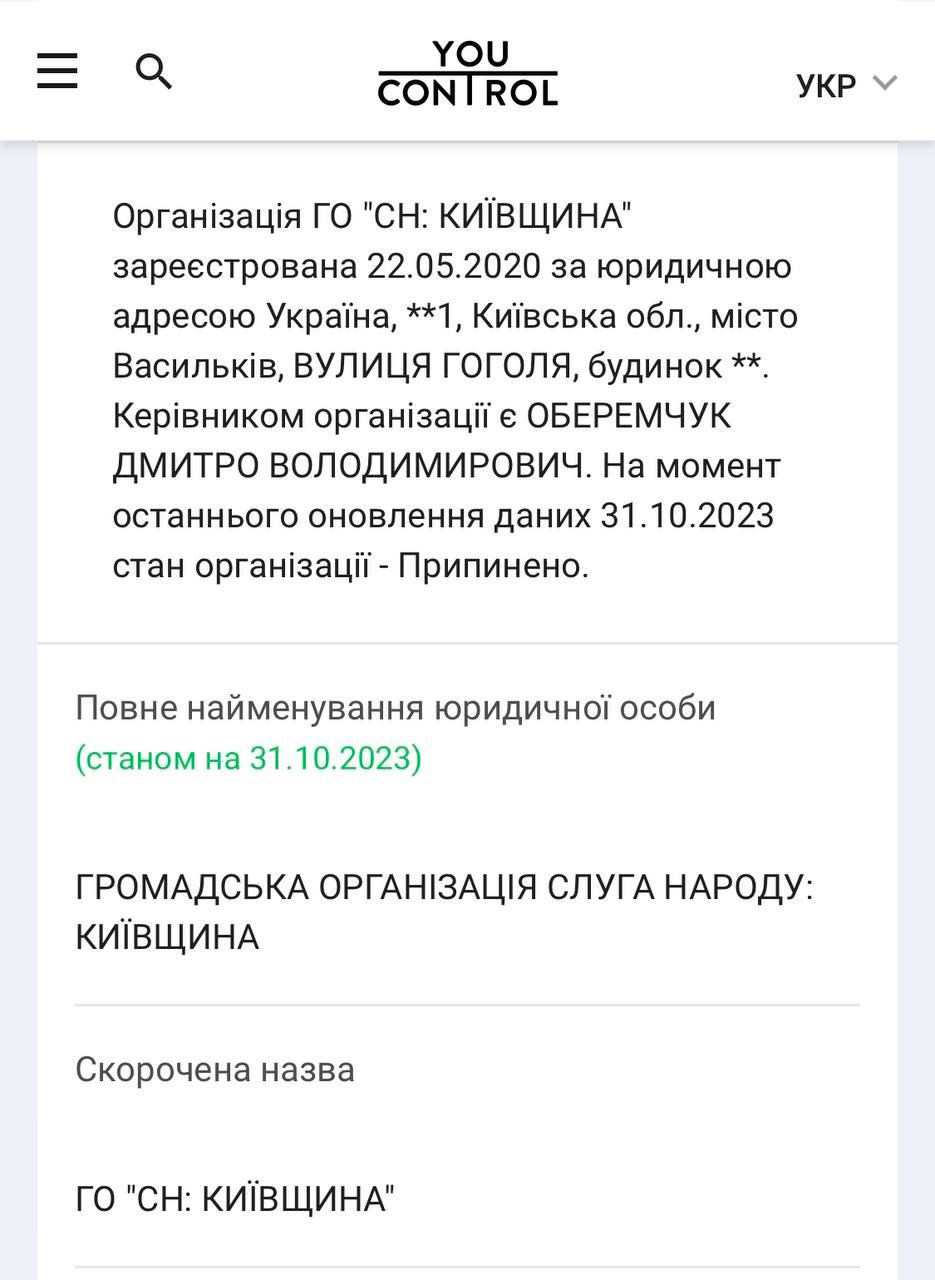 Также на имя Оберемчука зарегистрированы две общественные организации "Слуга Народа: Херсонщина" и "Слуга Народа: Киевщина", об этом также свидетельствуют данные из системы YouControl.