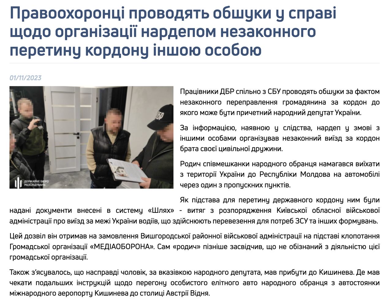 Государственное бюро расследований сообщает об обысках по делу об организации действующим нардепом незаконного выезда за границу для брата своей гражданской жены.