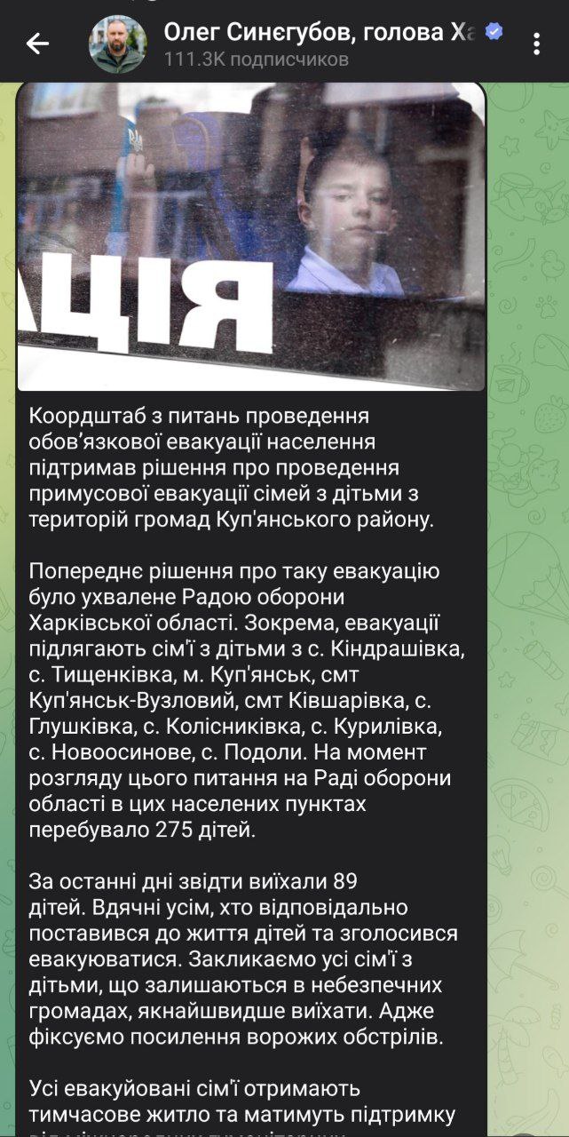 Ранее Синегубов сообщал, что почти три сотни детей принудительно эвакуируют из Купянского района.