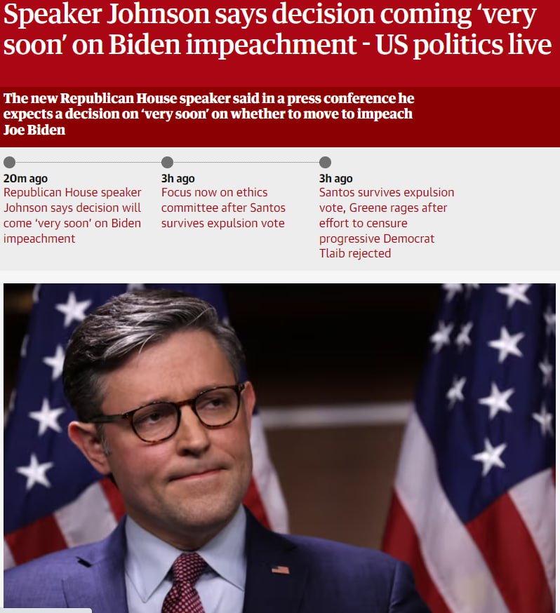 Предшественник Джонсона Кевин Маккарти объявил о расследовании поведения президента в сентябре, за несколько недель до того, как правые республиканцы и демократы сняли его с поста спикера. Расследование сосредоточено на обвинениях в коррупции в отношении президента и его семьи, особенно его сына Хантера Байдена.