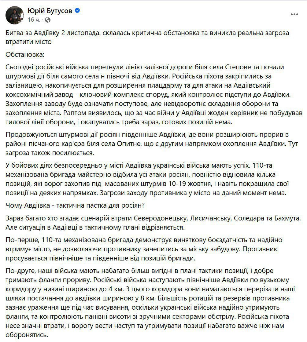 "Российская пехота закрепилась за железной дорогой, накапливается для расширения плацдарма и для атаки на Авдеевский коксохимический завод – ключевой комплекс сооружений, контролирующий подходы к Авдеевке. Захват завода будет означать постепенное, но неотвратимое складывание обороны и захват города", - пишет Бутусов.
