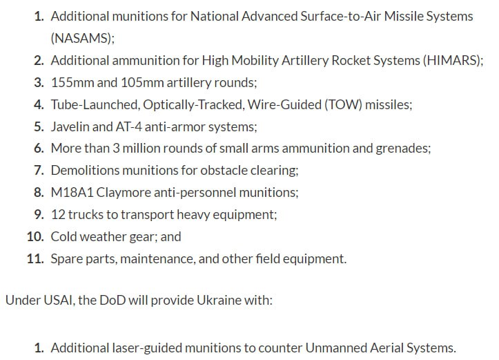 - дополнительные боеприпасы для высокомобильных артиллерийских ракетных систем (HIMARS);
