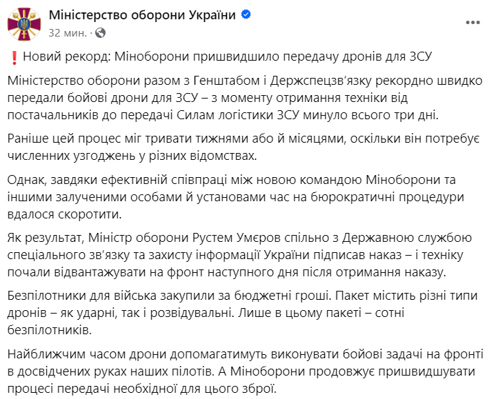 "С момента получения техники от поставщиков до передачи Силам логистики ВСУ прошло всего три дня. Ранее этот процесс мог длиться неделями или месяцами, поскольку он нуждается в многочисленных согласованиях в различных ведомствах", - заявили в МО, комментируя передачу войскам новой партии из сотен беспилотников.