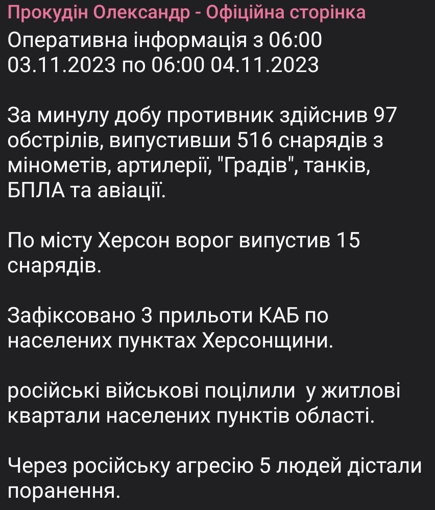 "За минувшие сутки противник совершил 97 обстрелов, выпустив 516 снарядов из минометов, артиллерии, "Градов", танков, БПЛА и авиации. По городу Херсон враг выпустил 15 снарядов. Зафиксировано 3 прилета КАБ по населенным пунктам Херсонской области", – отметил Прокудин.