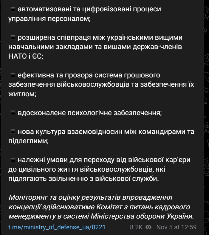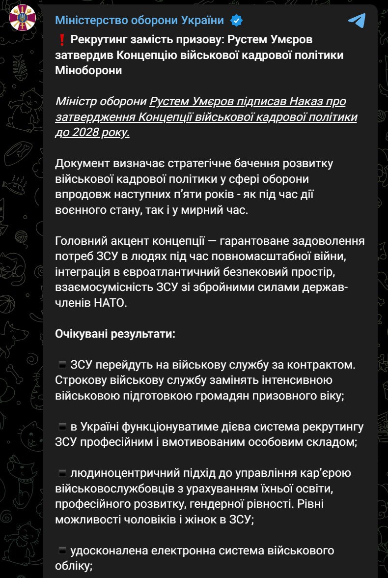 Главное положение документа, которое планируется выполнить до 2028 года, - "гарантированное удовлетворение потребностей ВСУ в людях во время полномасштабной войны".  К этому сроку ожидается, что ВСУ откажутся от срочной службы. Ее заменят интенсивной военной подготовкой граждан призывного возраста.