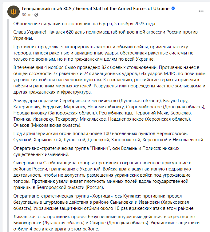Война в Украине идет уже 620-й день. Мы следим за последними новостями и ключевыми событиями 5 ноября 2023 года в обновляемом онлайне.