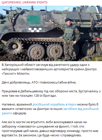 Во время российского удара "Искандером" погиб один из лучших артиллеристов Украины Дмитрий Милютин с позывным "Таксист".
