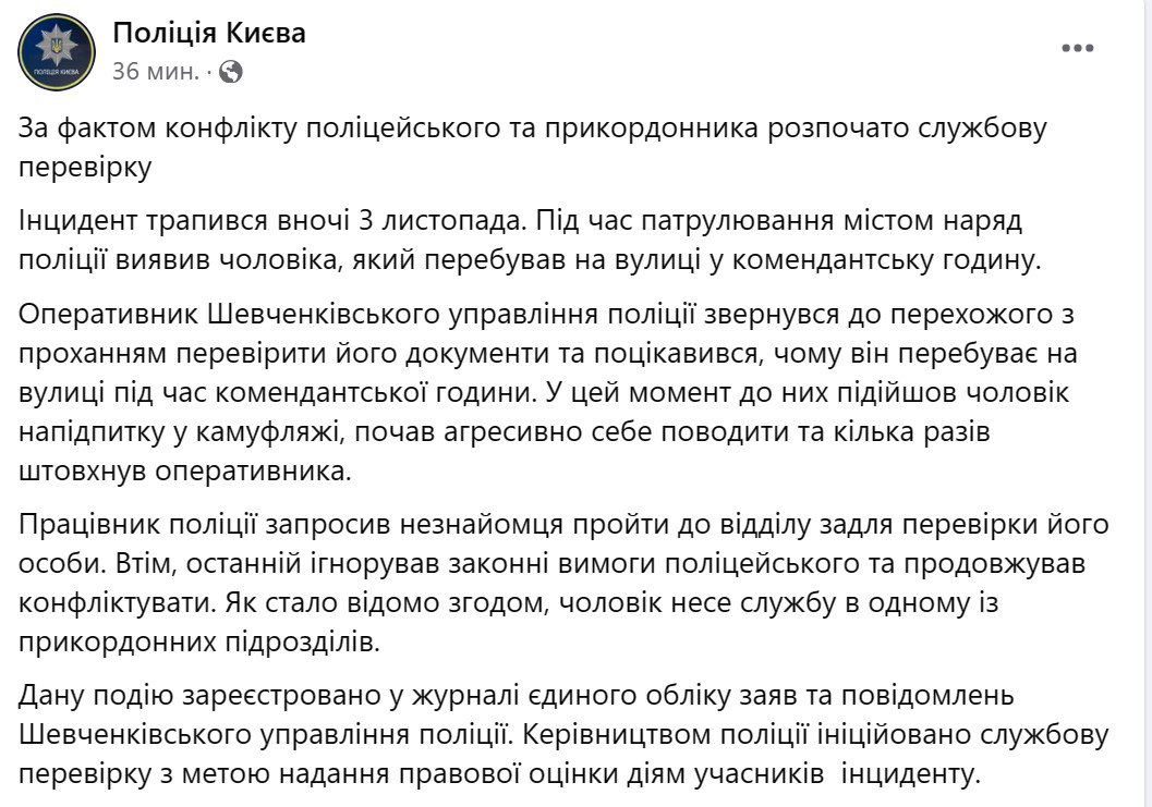 "В тот день военный возвращался из Киева к месту расположения части. Его поезд отходил с железнодорожного вокзала ночью. Там он и находился на момент начала комендантского часа. Что привело к конфликту и его детальные обстоятельства - сможем более подробно сказать после всех мероприятий проверки. Поддерживаем связь с национальной полицией, чтобы все было объективно", - сказал Демченко.